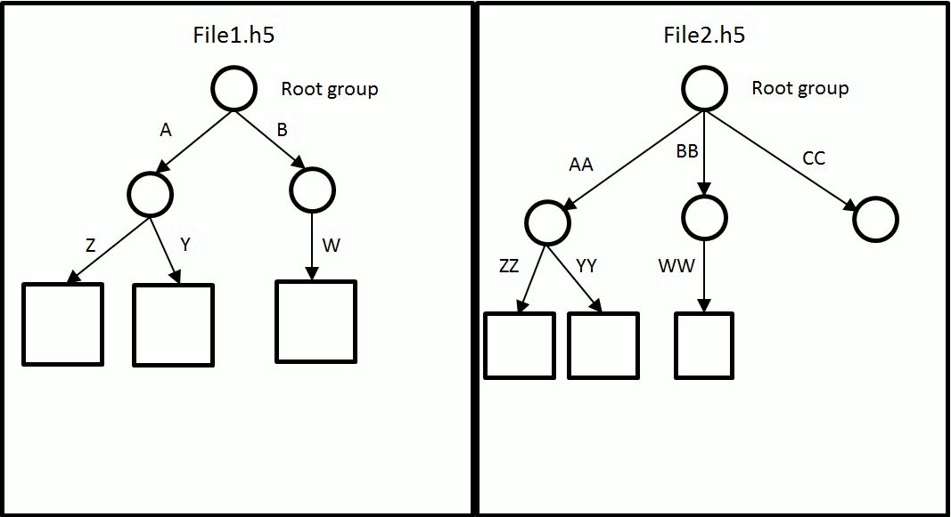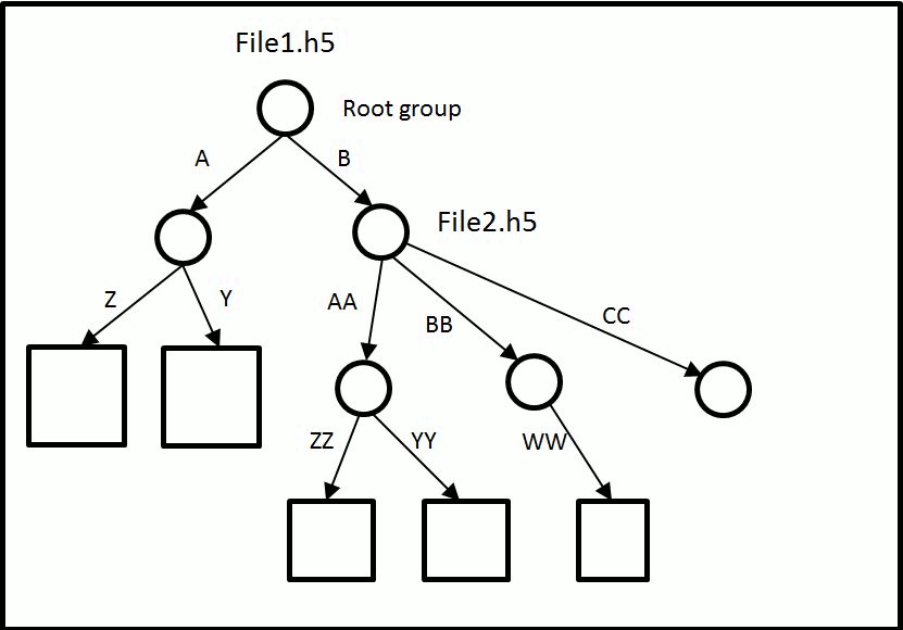 Multiple HDF5 files can be associated so that the files can be worked with as though all the information is in a single HDF5 file. A temporary association can be set up by means of the H5Fmount function. A permanent association can be set up by means of the external link function H5Lcreate_external.