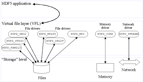 Note that the low-level file drivers manage alternative file storage layouts. Dataset storage layouts (chunking, compression, and external dataset storage) are managed independently of file storage layouts.