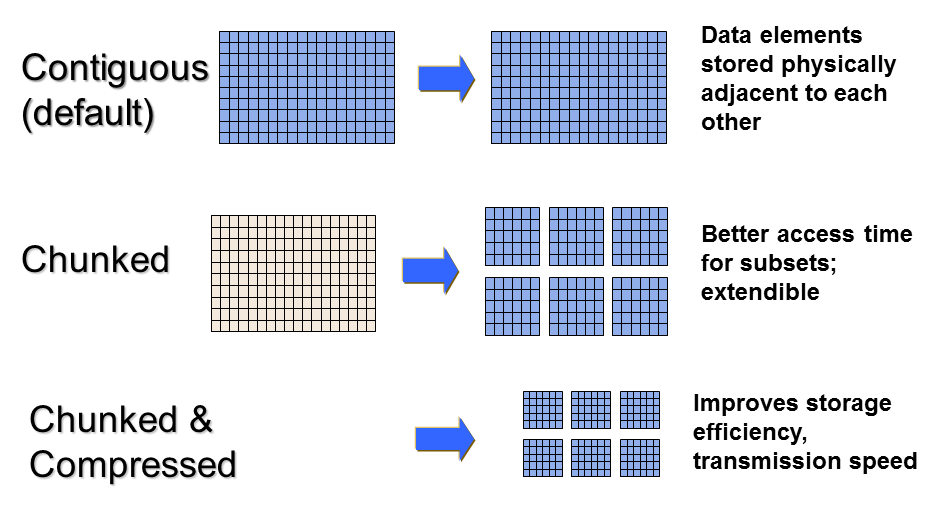 For example, the data storage layout property of a dataset is contiguous by default. For better performance, the layout can be modified to be chunked or chunked and compressed:
