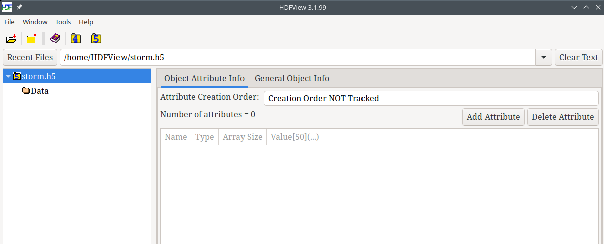 Click on the /Data folder in the tree view. You will see two tabs, Object Attribute Info and General Object Info, in the pane on the right site of the HDFView window.