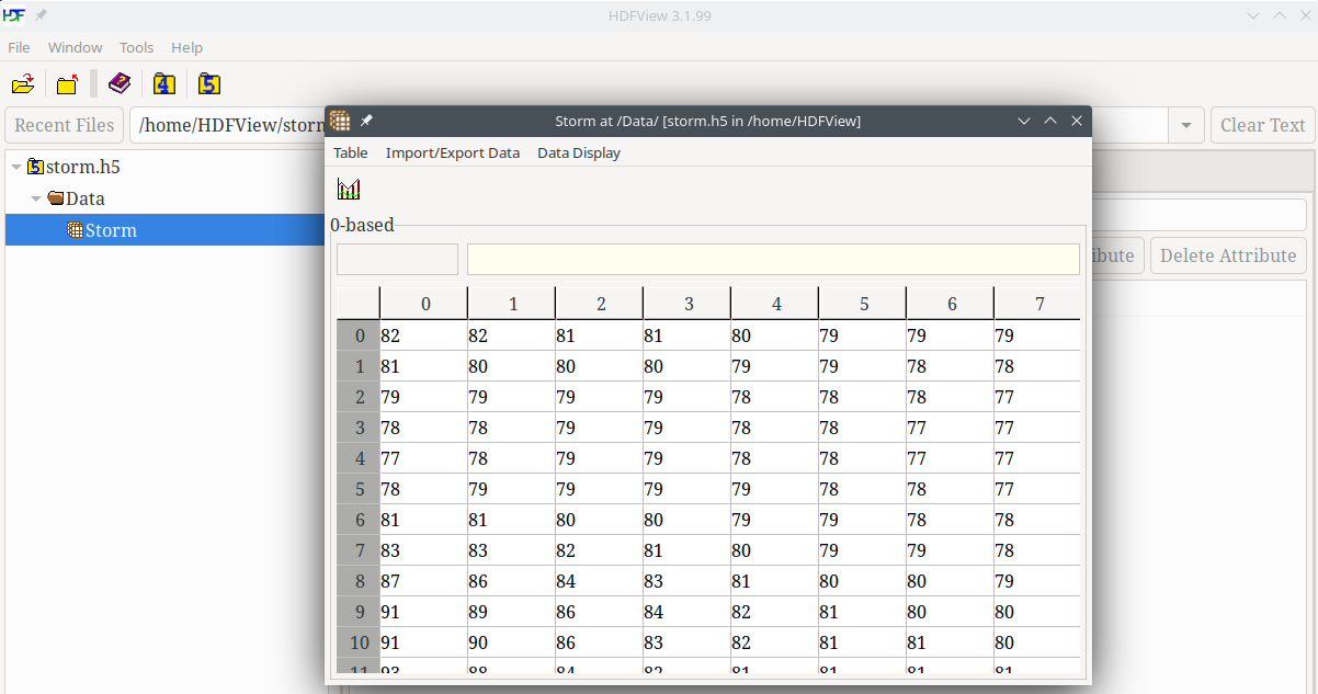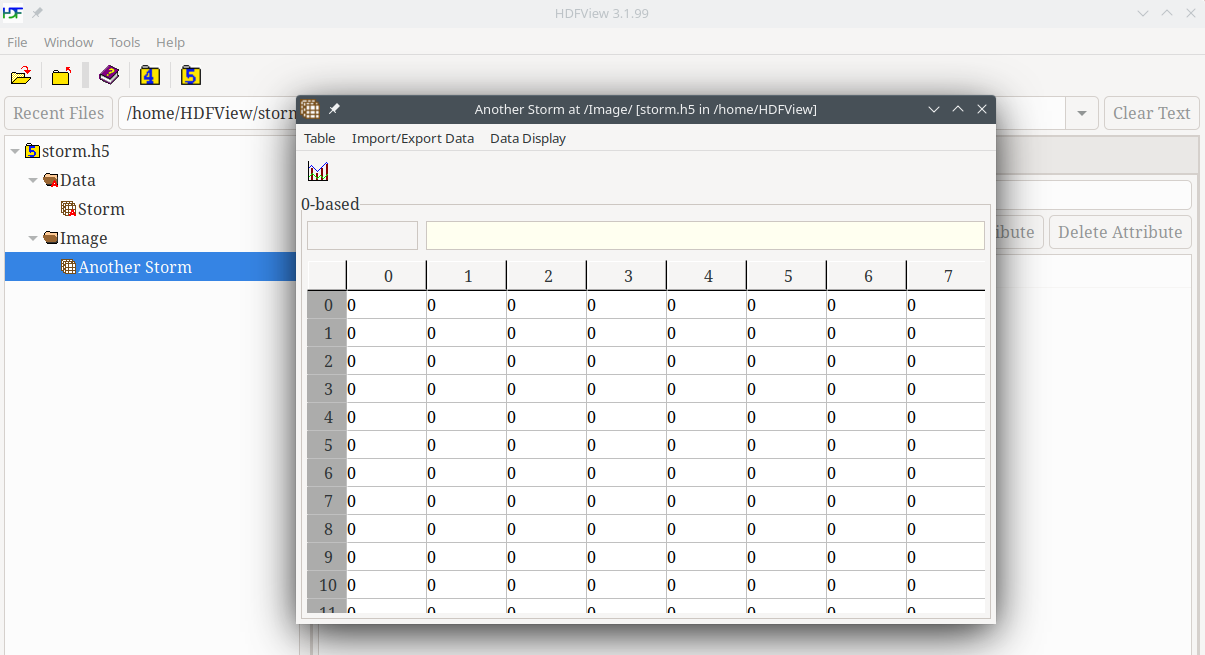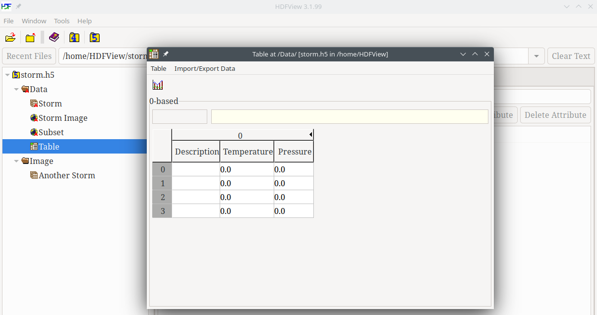 Specify a location and type in storm.h5 for the name of your file, and click on the Save button. You will see the storm.h5 file in the TableView: