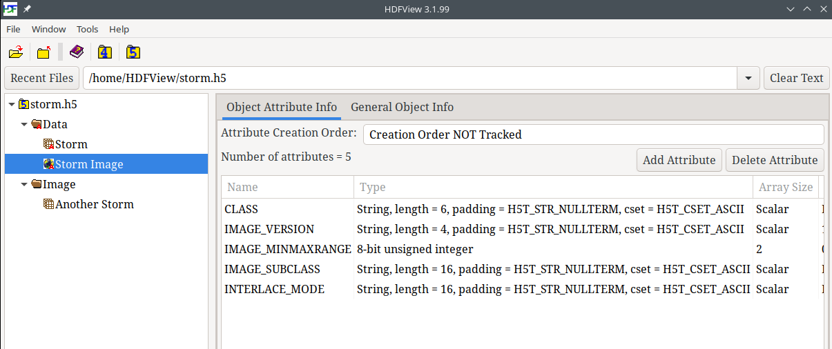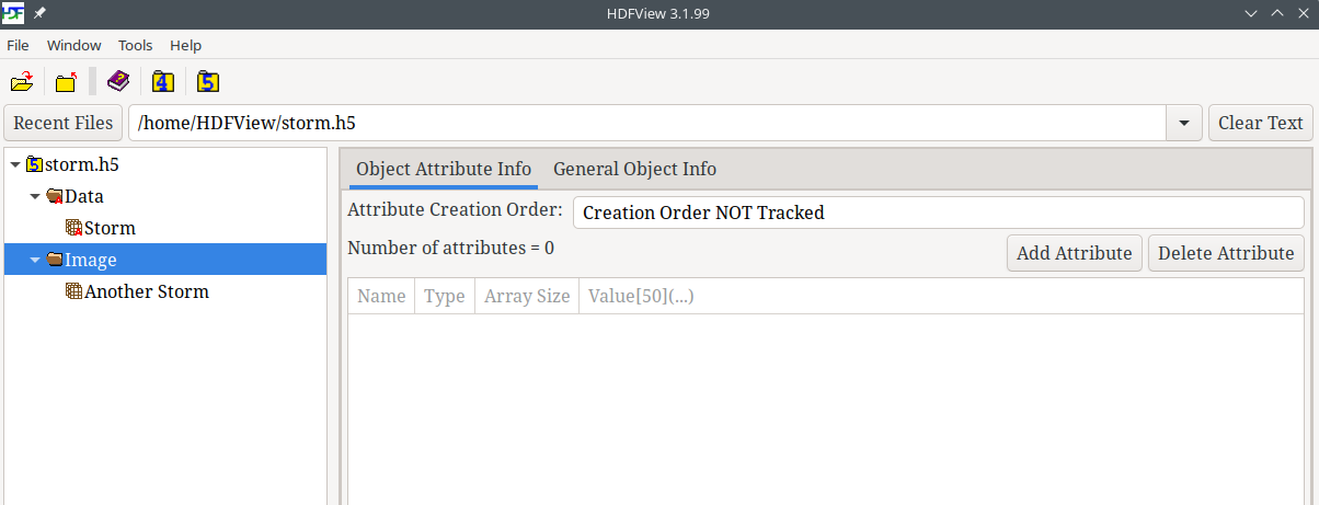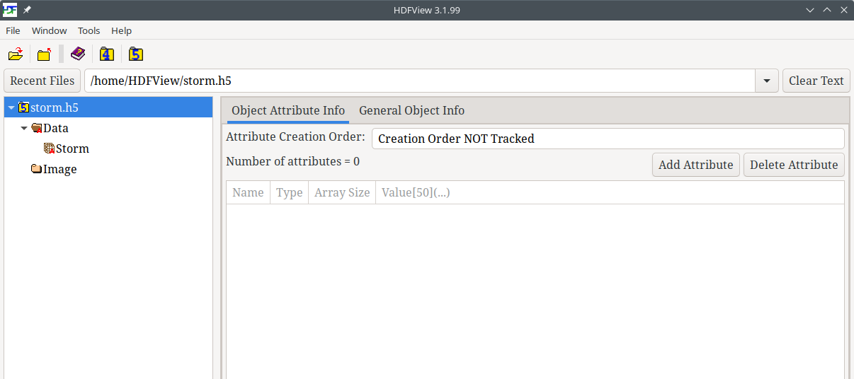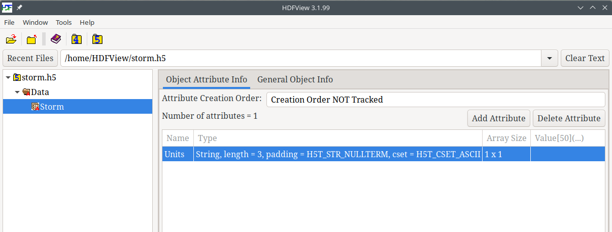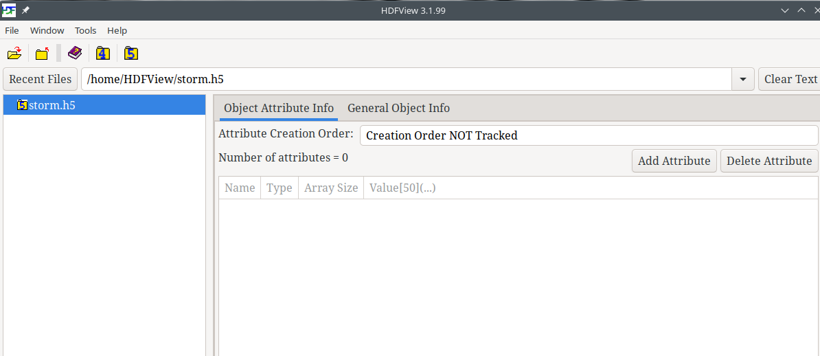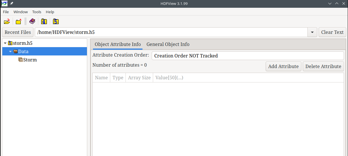 Left mouse click on the /Storm dataset in the tree view. You will see the Object Attribute Info and General Object Info tabs on the right