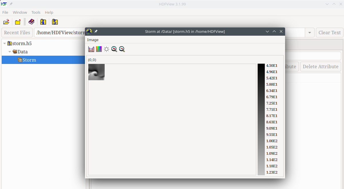 The steps below describe how to create a file (storm.h5), group (/Data), and a contiguous dataset (/Data/Storm) using HDFView. A group is an HDF5 object that allows objects to be collected together. A dataset is an array of data values. A contiguous dataset is one that is stored as a single block in the HDF5 file.